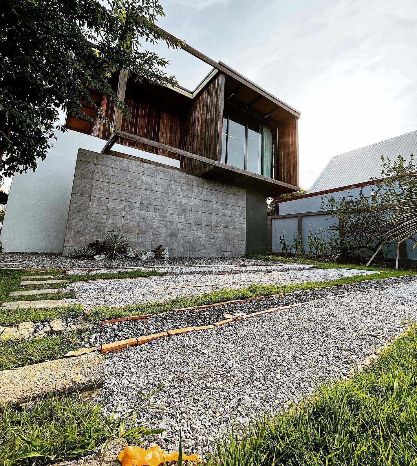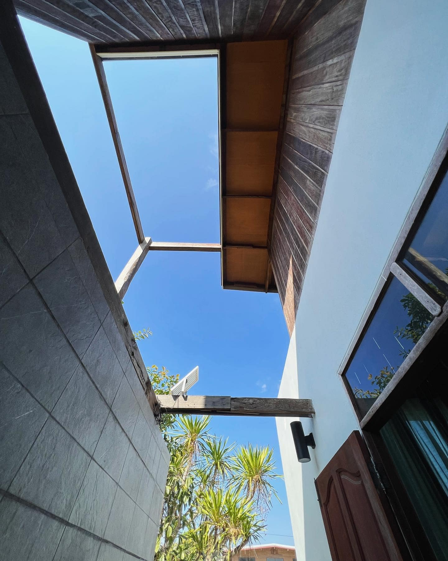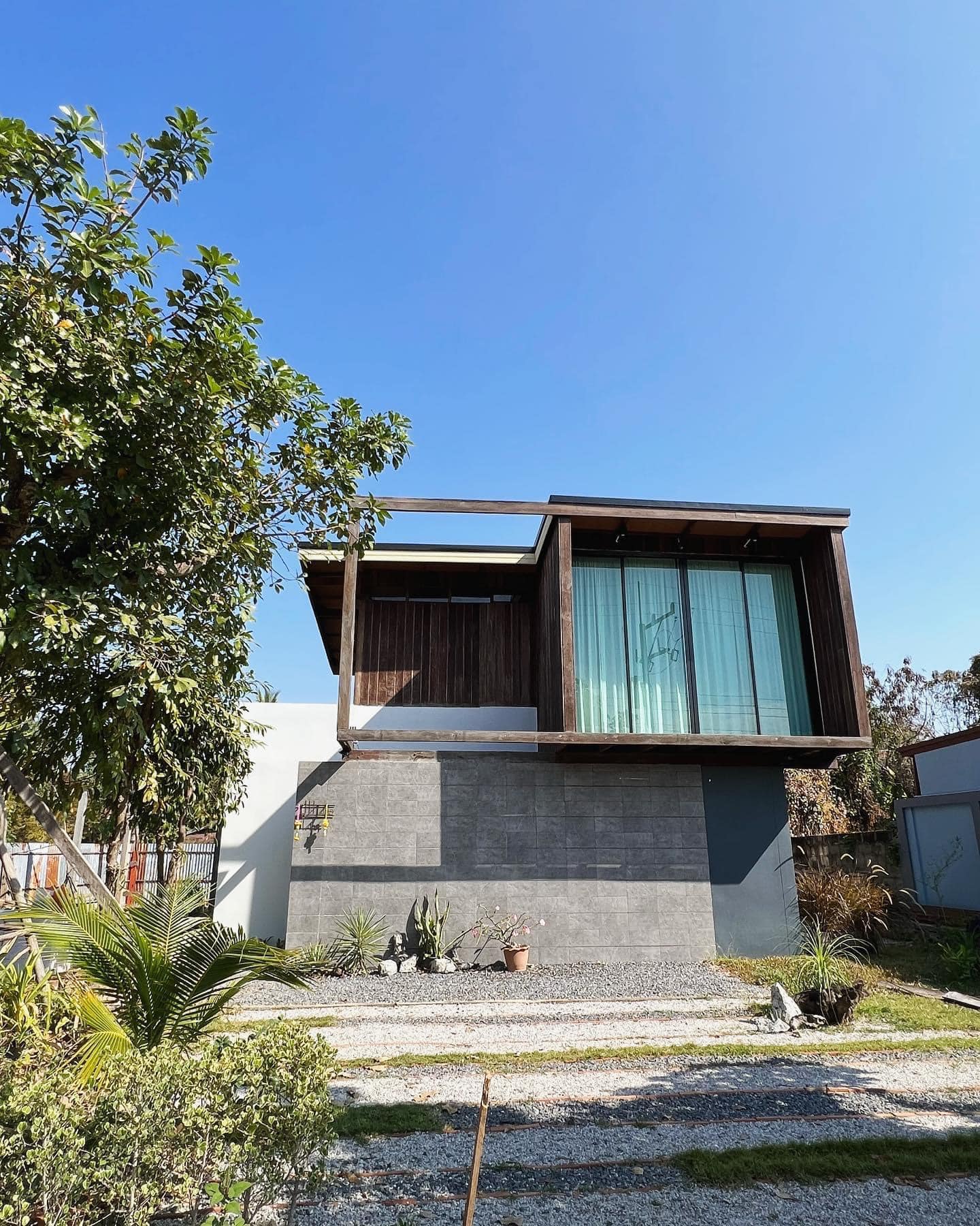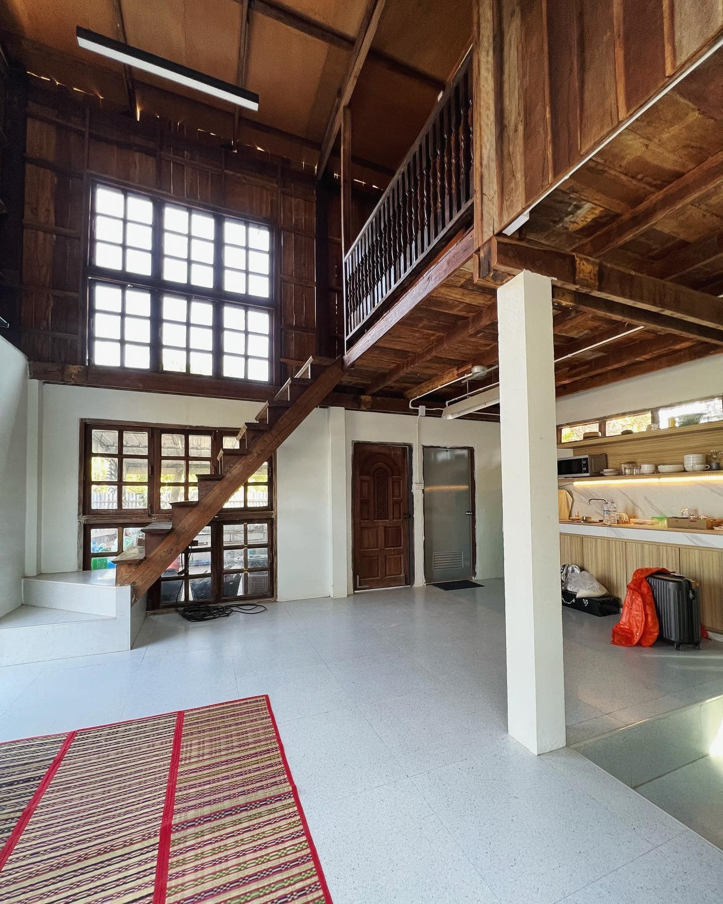 จากภายนอก เราจะเห็นดีเทลของการออกแบบชั้นสองที่มาในรูปทรงแบบเรขาคณิตที่ดูโมเดิร์น ในขณะที่วัสดุเป็นไม้เก่าแบบคลาสสิก จึงเป็นการผสมผสานที่ลงตัวเลยทีเดียว