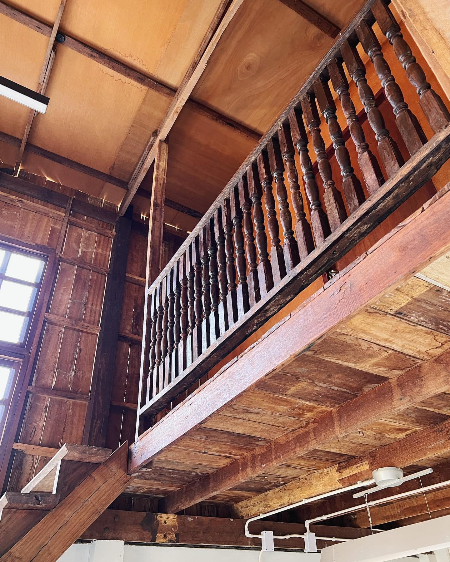 ในขณะที่ส่วนของชั้นสองจะมีความคลาสสิกที่สะท้อนผ่านการใช้ของตกแต่งแบบเดิม ๆ อย่างเช่นราวกันตกตรงนี้ที่หยิบมาจากบ้านหลังเดิมเลย