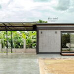 บริเวณหน้าบ้านออกแบบให้เป็นพื้นที่ระเบียงขนาดพอเหมาะ พร้อมกับราวกั้นงานไม้ ในขณะที่บริเวณด้านข้างที่เป็นใต้ถุนยกสูงนั้น มีพื้นที่เพียงพอสำหรับจอดรถและทำกิจกรรมต่าง ๆ ตามความต้องการ