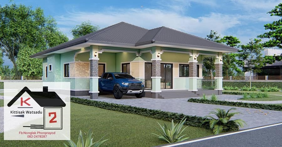 บ้านชั้นเดียวสไตล์ร่วมสมัย หลังนี้เป็นตัวอย่างผลงานจาก คุณ Nonglak Phonprayod ที่ได้เน้นตัวบ้านให้ดูเรียบง่าย อบอุ่น ให้ความรู้สึกที่เป็นกันเอง นอกจากนี้ยังเน้นใช้โทนสีที่เย็นสบายตา อย่างสีเขียวมิ้นต์ ตัดกับสีเทาของผนังอิฐและหลังคา แบบที่สีทั้งสองสีไม่ตัดกันอย่างรุนแรงจนเกินไป แต่ให้ลักษณะที่ค่อนข้างกลมกลืนกันมากกว่า