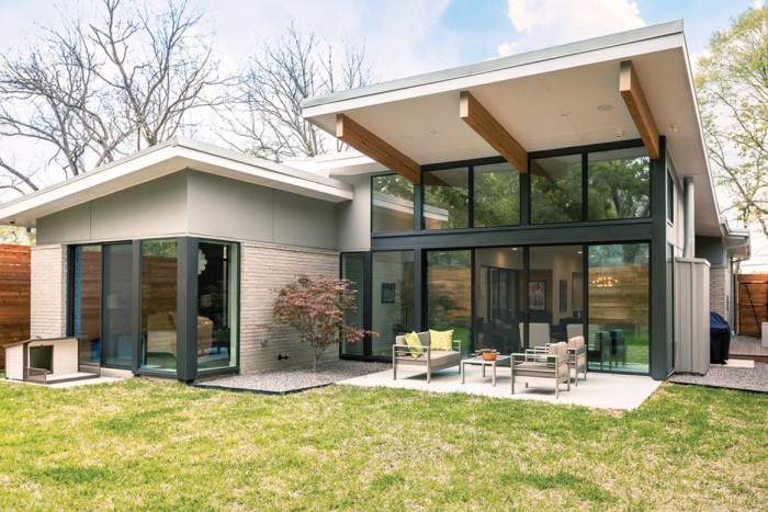 ตัวบ้านทรงกล่อง ที่แยกออกเป็นสองส่วน โดยมีพื้นที่พักผ่อนกลางแจ้งที่หน้าบ้าน เชื่อมต่อกันเอาไว้ จับคู่กับหลังคาเพิงหมาแหงนชิ้นใหญ่ เปิดรับหน้าบ้านได้ดีเยี่ยม