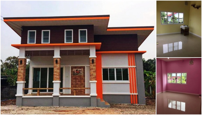 บ้านหลังนี้เป็นผลงานการออกแบบจาก แบบบ้าน แสงตะวัน ผนังก่ออิฐฉาบปูนแต่งแต้มด้วยโทนสีขาวแซมเทา กรุแต่งเพิ่มดีเทลด้วยกระเบื้องหินเทียมเลียนสีธรรมชาติ เสริมความโดดเด่นให้กับบ้านตัวบ้านด้วยครีบปูนสีส้มสด หลังคามุงเมทัลชีททรงเพิงหมาแหงน มาพร้อมช่องหน้าต่างขนาดเล็กช่วยในเรื่องของการระบายอากาศ