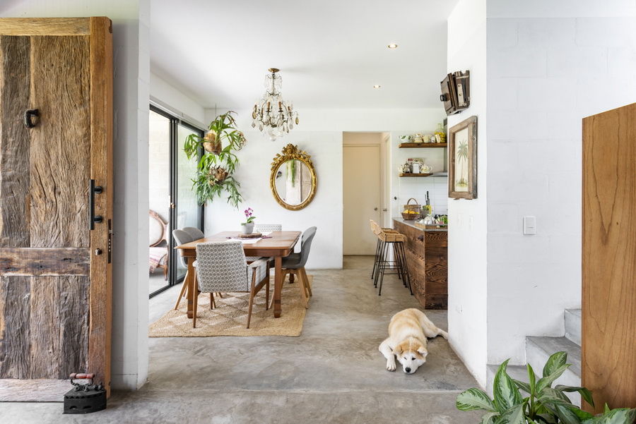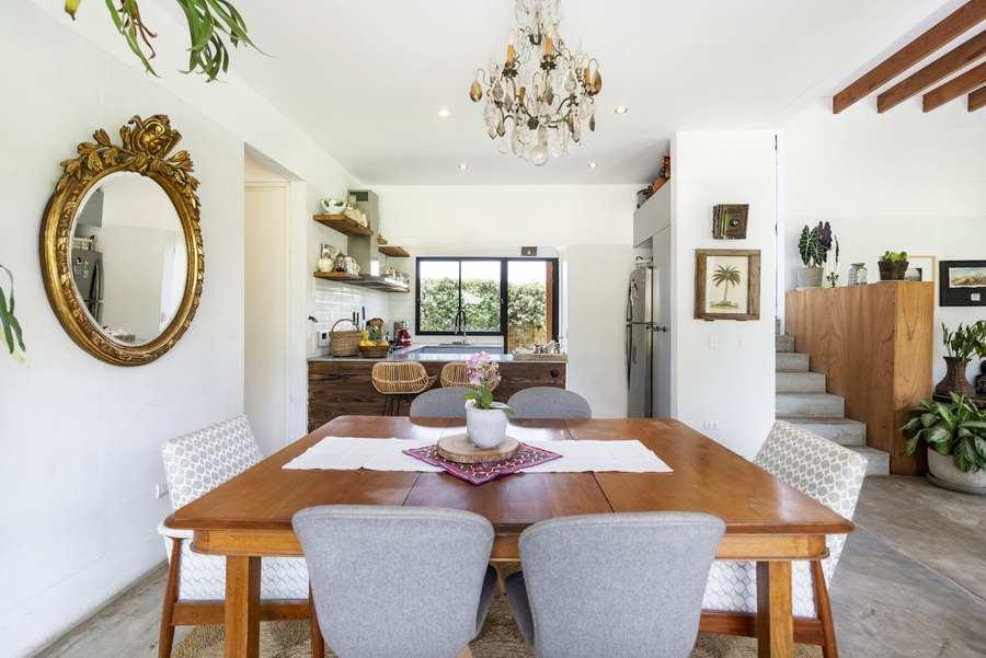 ถัดออกมาจากห้องครัวก็จะเป้นพื้นที่รับประทานอาหาร โดยตัวโต๊ะมีรูปทรงจัสตุรัส ทำให้สามารถรับประทานอาหารได้อย่างสะดวกทุกมุม