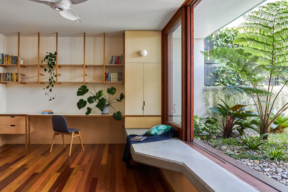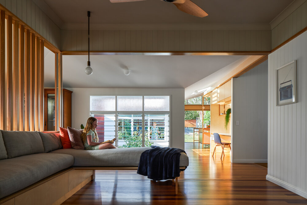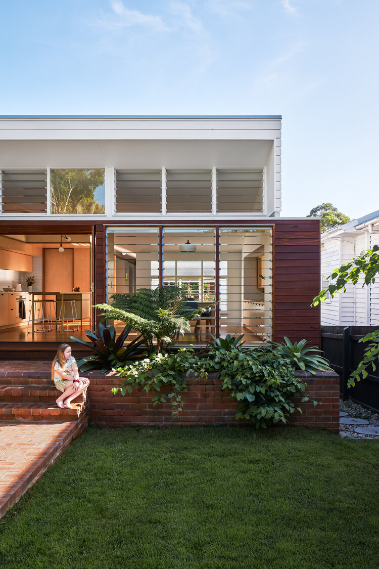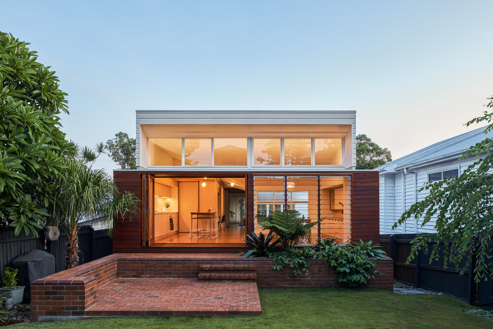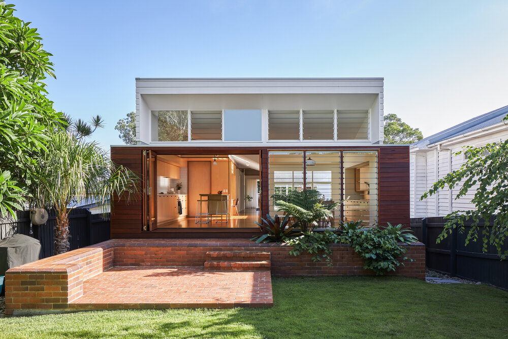 บ้านทรงโมเดิร์น ตกแต่งด้วยผนังไม้และอิฐโชว์แนว มาพร้อมสนามหญ้าหลังบ้านที่กว้างและโปร่งสบาย