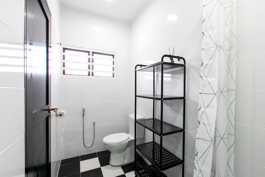 พื้นที่สุดท้ายอย่างห้องน้ำ เป็นอีกห้องที่มีการออกแบบและตกแต่งอย่างเรียบง่าย โดยมีโทนการตกแต่งในโทนสีขาว-ดำ พร้อมฟังก์ชันการใช้งานที่เรียบง่ายสะดวกทุกการใช้งาน