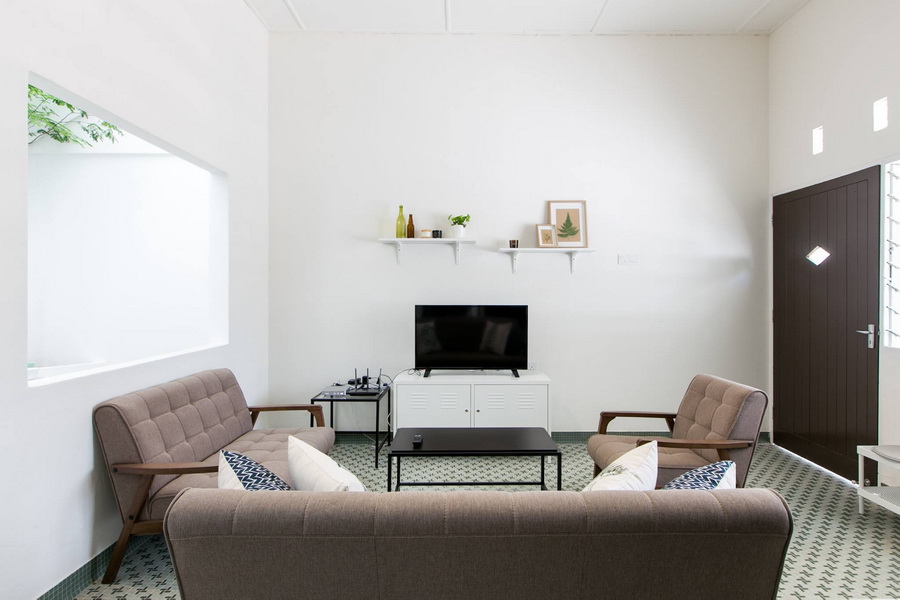 เมื่อเข้ามาภายในบ้าน เราก็จะพบกับห้องโถงนั่งเล่นของบ้าน ซึ่งภายในตกแต่งด้วยเฟอร์นิเจอร์ชุดรับแขกชุดใหญ่ ที่สามารถรองรับผู้คนได้ 5-6 คน ที่ผนังด้านหนึ่งจะมีช่องขนาดใหญ่เอาไว้ เพื่อสร้างบรรยากาศที่เชื่อมต่อไปยังห้องรับประทานอาหาร
