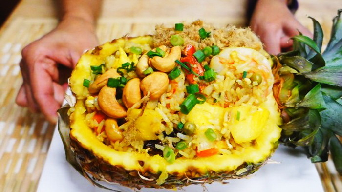 10. เสร็จแล้วจัดจาน นำลูกสับปะรดที่คว้านมาแล้วนำข้าวผัดสับปะรดใส่ ให้สวย โรยด้วยเมล็ดมะม่วงหิมพานต์ทอด และเติมหมูหยอง โรยด้วยต้นหอมซอยอีกนิดหน่อย เป็นอันเสร็จแล้ว