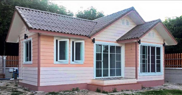 ลักษณะบ้านชั้นเดียว ออกแบบเรยบง่ายสไตล์คอจเทจ ผนังภายนอกดีไซน์ด้วยผนังไม้เทียม ตกแต่งด้วยโทนสีชมพูอ่อน หลังคาของบ้านออกแบบด้วยหลังคารูปทรงหน้าจั่ว มุงด้วยกระเบื้องลอนในโทนสีเข้ม ผนังรอบตัวบ้านยังติดตั้งประตูและหน้าต่างกระจกใสบานใหญ่เพื่อช่วยให้บ้านเย็นสบาย