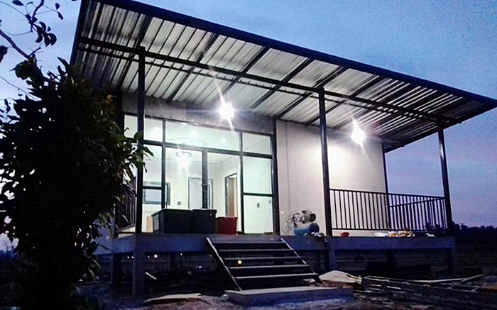 ลักษณะเป็นบ้านยกพื้นสูง โครงสร้างภายนอกเป็นเหล็กตกแต่งด้วยสีดำทั้งโครงหลังคา รั้วระเบียง และกรอบประตูอลูมิเนียม รับกับผนังสไตล์ปูนเปลือยแบบดิบ หลังคามุงเหล็กรีดลอนทรงเพิงหมาแหงน ดูโดดเด่นสะดุดตา ท่ามกลางพื้นที่ธรรมชาติ