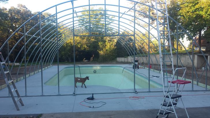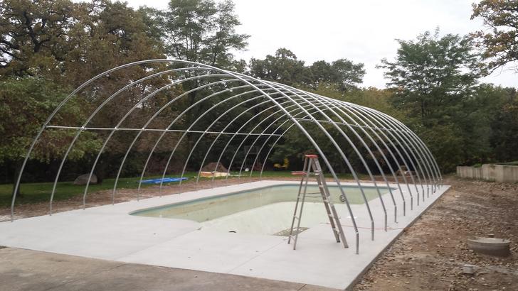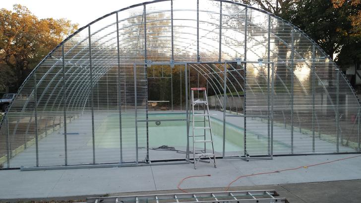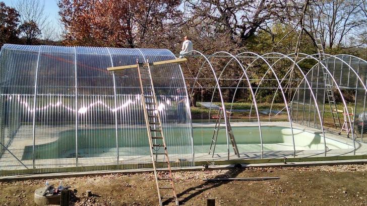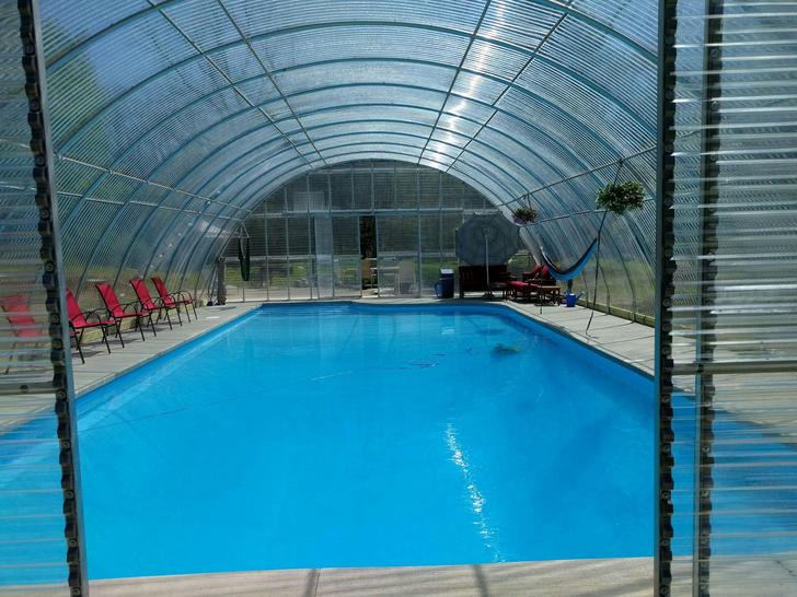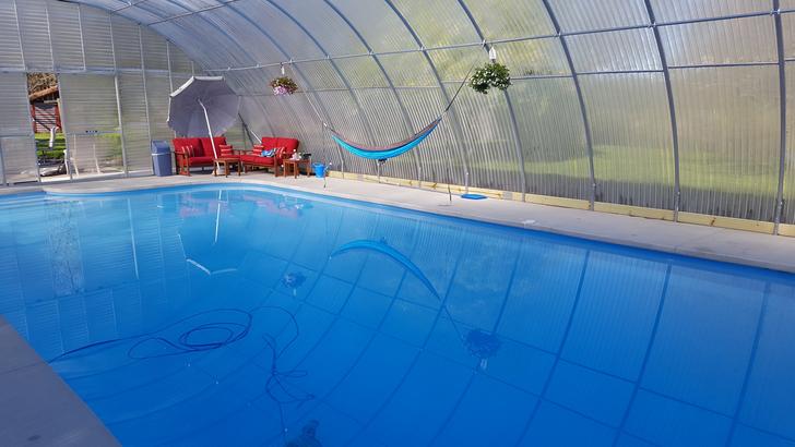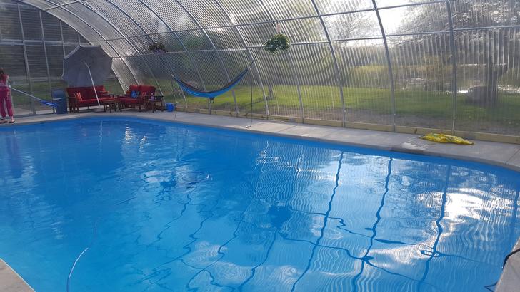 ก่อนอื่นเรามาชมภาพของสระน้ำที่เสร็จสมบูรณ์กับก่อน สระสีฟ้าน้ำใสอยู่ภายใต้หลังคาทรโค้งแบบโปร่งแสง รอบสระตกแต่งด้วยเฟอร์นิเจอร์แบบชายหาด เป็นมุมพักผ่อนและออกกำลังกายที่เพอร์เฟ็คสุด ๆ ของครอบครัวเลยทีเดียว