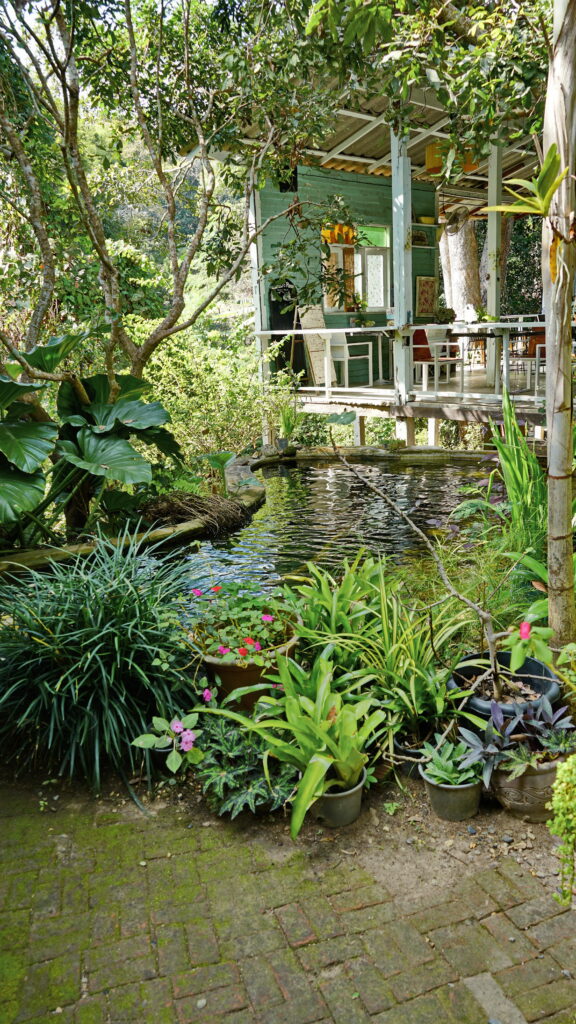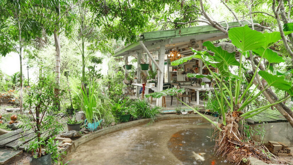 บ่อเลี้ยงปลาที่กลมกลืนกับต้นไม้นานาชนิดในร้าน