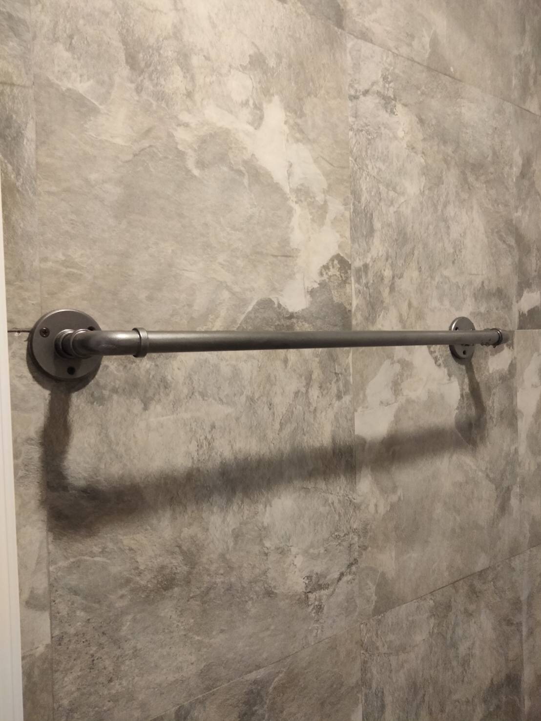 มีสุขภัณฑ์ให้ อ่างล้างหน้าให้ ฝักบัวให้ แต่ลืมให้ราวแขวนผ้าเรา อันนี้เราจัดเอง แนวท่อ ๆ สวยดี
