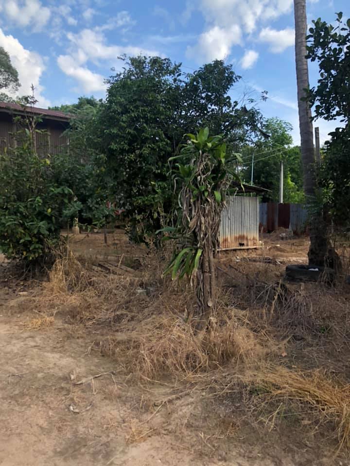 ทางเจ้าของที่ให้พิกัดมาแล้วให้เราเข้าไปดูที่เอง บอกว่าเข้าไปได้เลย ไม่มีคนอยู่ จริง ๆ เราก็กลัวนะทั้งกลัว ผี กลัวหมา กลัวโจร เอาว๊ะ ตะโกนบอกเจ้าที่เจ้าทาง แล้วเลยเข้าไปสำรวจ ก็เจอบ้านไม้เก่า ๆ กับต้นไม้แก่ ๆ โทรม ๆ
