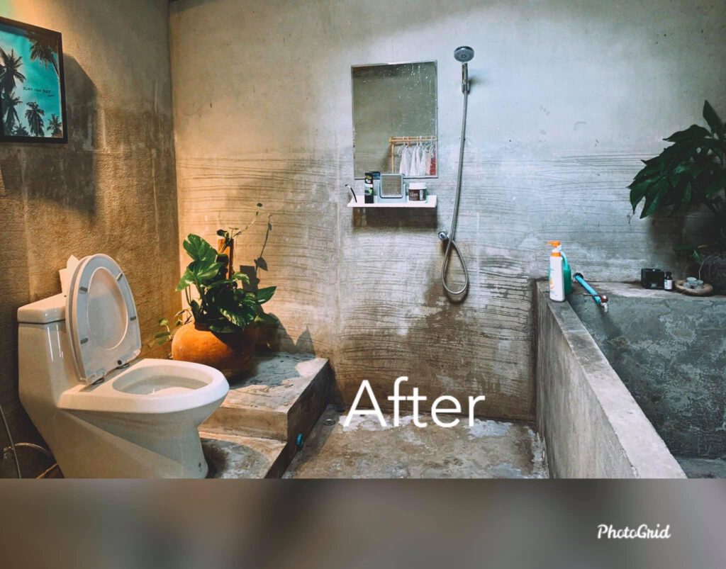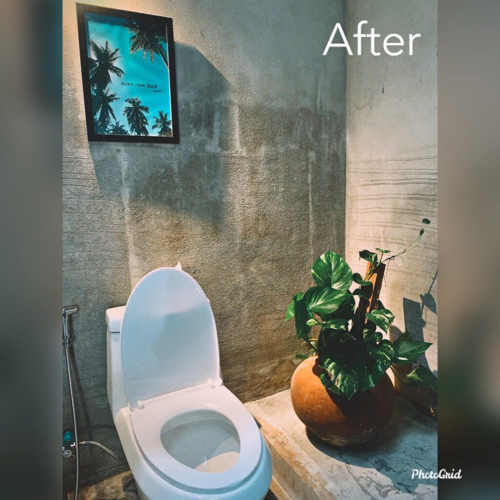 โดยจะสังเกตเห็นว่ายังคงความเป็นห้องน้ำปูนดิบๆ อยู่ ชักโครกก็ยังอยู่ที่เดิม เพิ่มอุปกรณ์เสริมเข้ามา และตกแต่งให้สวยขึ้นอีกนิดหน่อย ทำให้ดูน่าใช้งานกว่าเดิมเยอะเลยล่ะ