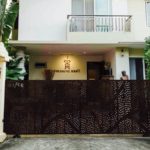 บริเวณทางเข้าบ้านจะมีหลังคาไม้ที่ติดตั้งหลอดไฟไว้รอบๆ ยื่นออกมาจากตัวบ้านและมีลานกระเบื้องขนาดพอเหมาะ พร้อมโต๊ะและเก้าอี้ที่จัดไว้เป็นพื้นที่นั่งพักผ่อน ชมวิวสวนสีเขียวที่อยู่รอบบ้าน