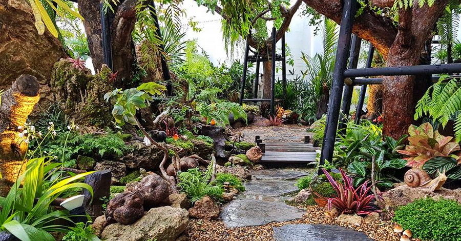 ยิ่งช่วงหน้าฝนที่เม็ดฝนโปรยปรายลงมายังพื้นที่สวนยิ่งให้ความสวนงามชุ่มชื่น เพราะพันธุ์ไม้สวนใหญ่ที่นำมาปลูกและตกแต่งเป็นไม้ที่ชอบน้ำสูง