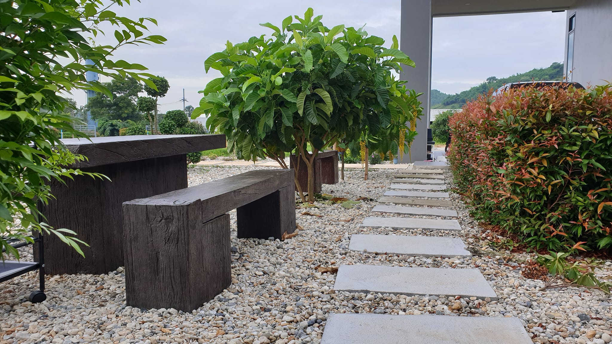โต๊ะและม้านั่งหินที่ตั้งอยู่ในบรรยากาศร่มรื่น พื้นที่โรยด้วยหินกรวดแม่น้ำทำให้พื้นไม่แฉะหรือสกปรกจากดิน ทำให้เป็นมุมนั่งเล่นได้บ่อยตามต้องการเลยล่ะ