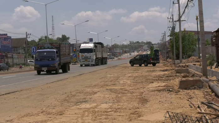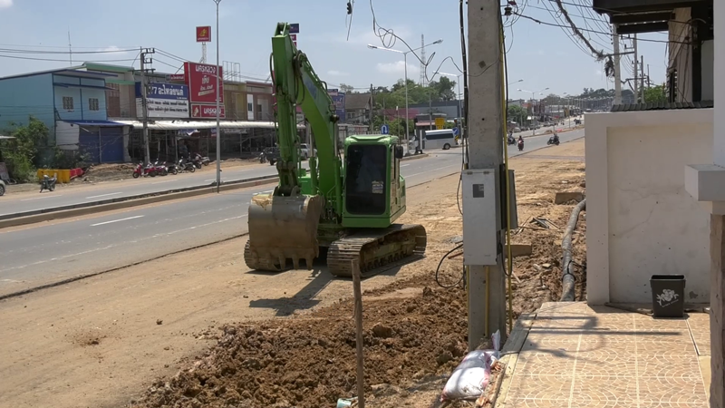 พื้นที่ถนนที่กำลังก่อสร้าง มีการใช้เครื่องจักรขนาดใหญ่