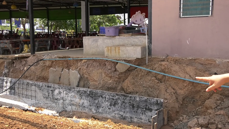 โดยบริเวณที่มีการขุดดินเพื่อขยายถนน เราจะเห็นได้จากภาพนี้ได้ชัดเจนว่าไม่มีการป้องกันดินสไลด์เลย ยิ่งช่วงฝนตกที่ผ่านมา ทำให้ดินที่อยู่ใต้อาหารของบ้านไหลออกมา ตัวบ้านหลายจุดเริ่มแตกร้าว