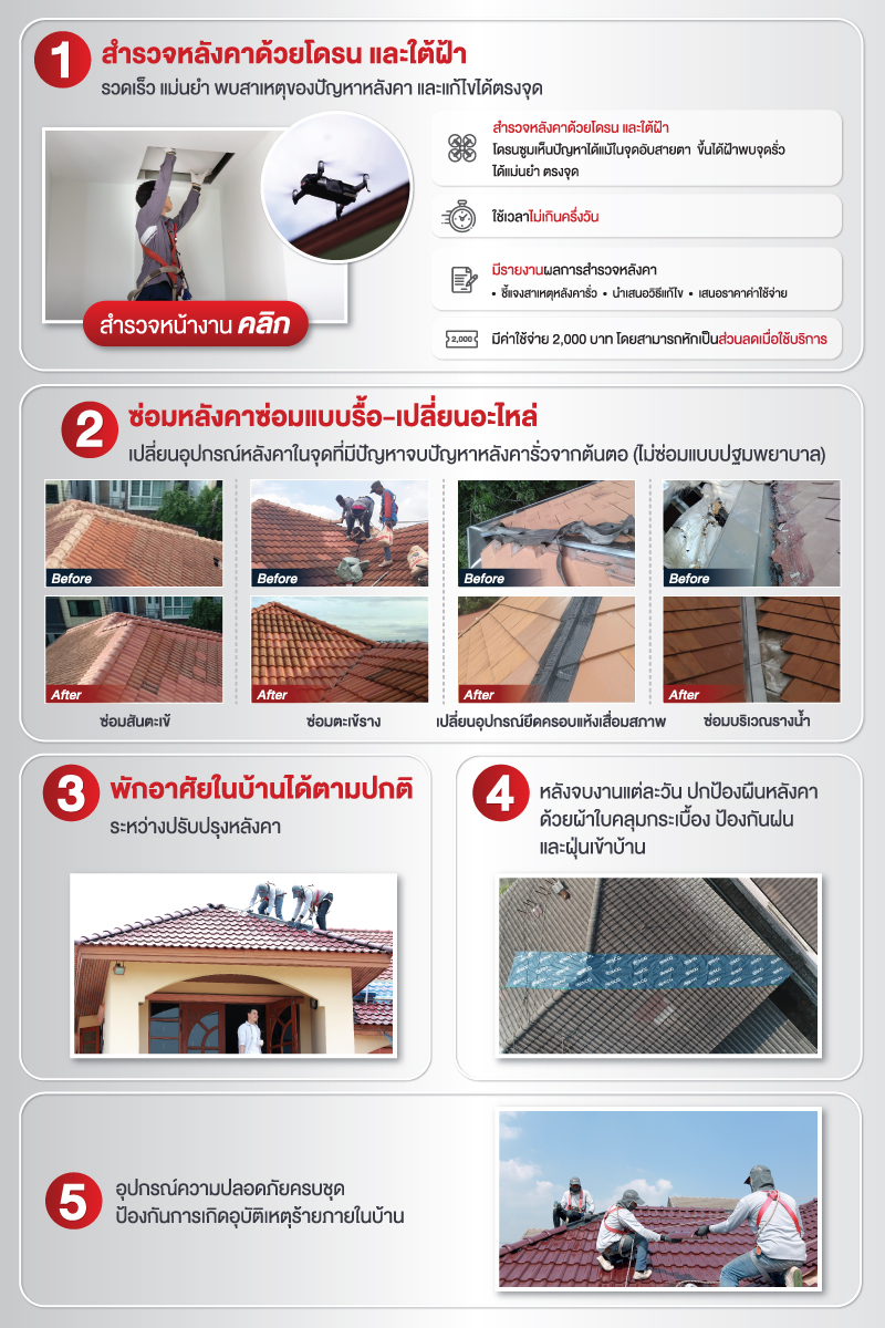 การให้บริการโดยทีมช่างที่เชี่ยวชาญและมีความเป็นมืออาชีพ จึงมีมาตรฐานและขั้นตอนให้การช่อมแซมหลังคาที่สะดวกและปลอดภัยในทุกขั้นตอน