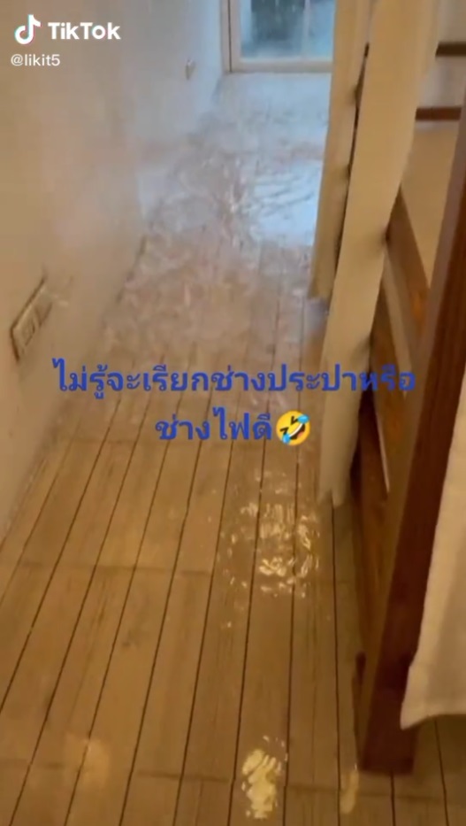 เพราะน้ำที่รั่วซึมออกมานั้นมีปริมาณมากอย่างกับเป็นน้ำตกภายในบ้านเลย ซึ่งน้ำที่รั่วก็ไหลซึมไปทั่วผ่านเครื่องใช้ไฟฟ้าทั้งแอร์ ทั้งหลอดไฟ