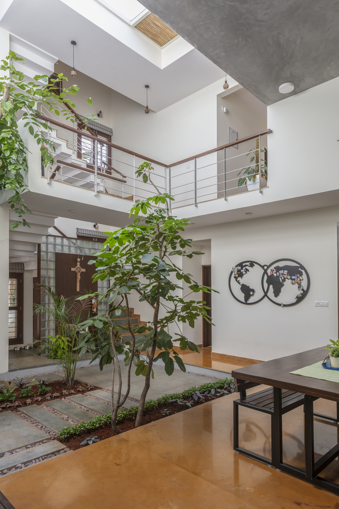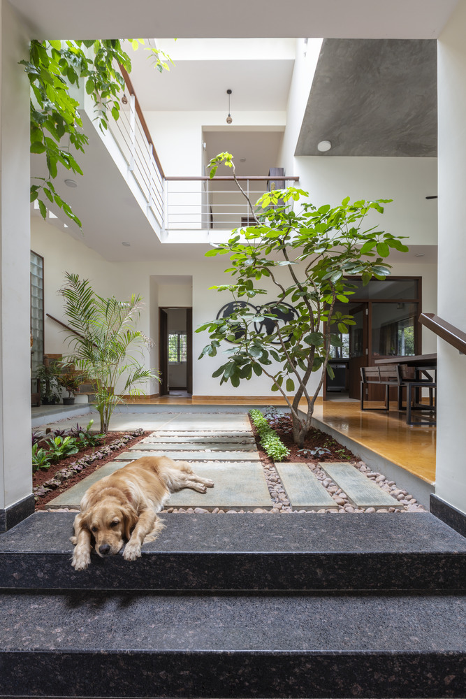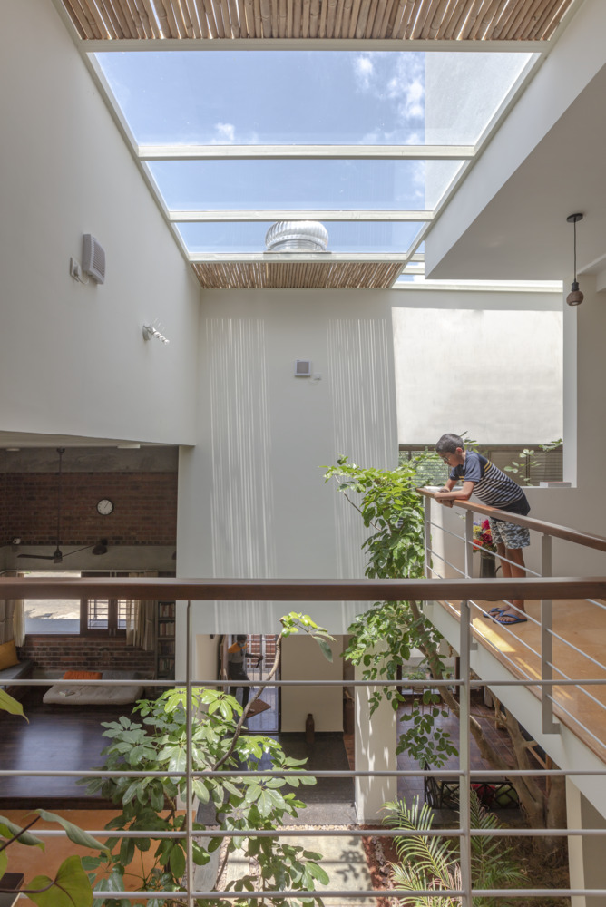 พื้นที่ตรงกลางของบ้านมีลักษณะที่โปร่งโล่ง ด้านบนสุดเป็นหลังคาแบบสกายไลท์ที่นำแสงมาสู่พื้นที่สวนด้านล่าง ซึ่งเป็นจุดที่เป็นไฮไลท์ของบ้านหลังนี้