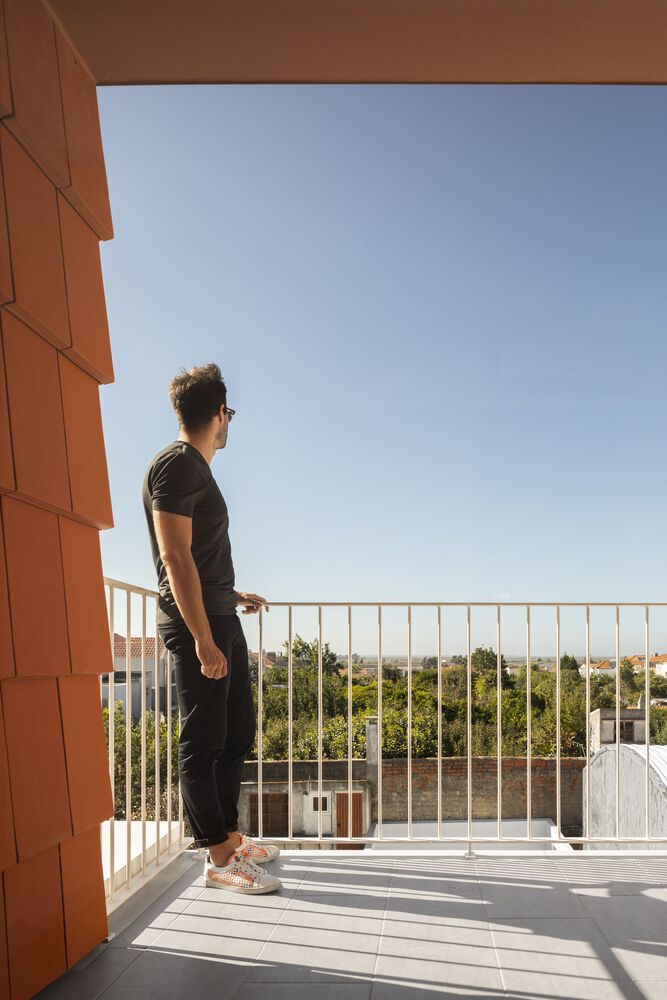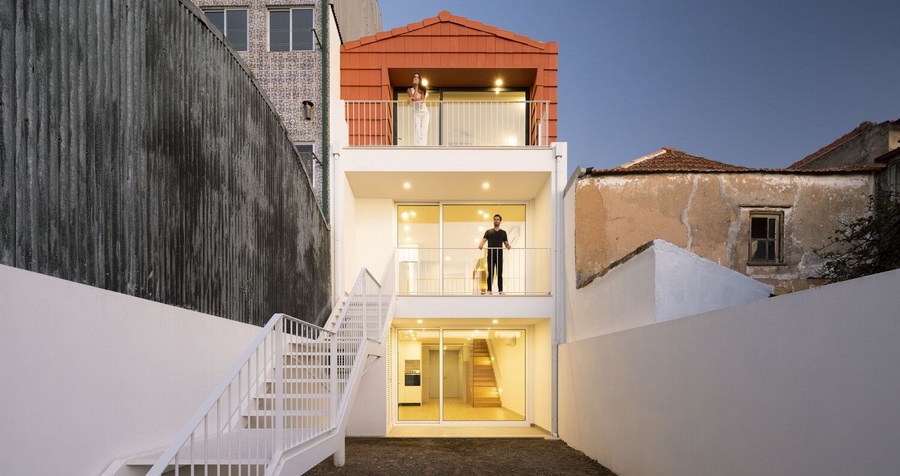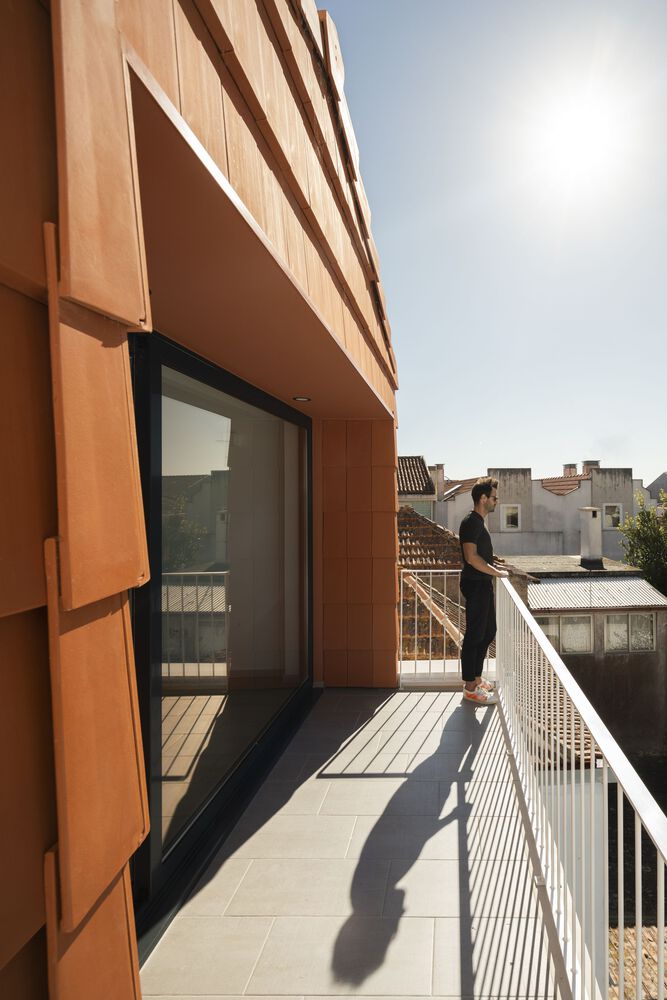 อีกจุดหนึ่งที่เป็นความโดดเด่นของบ้านหลังนี้ คือ บริเวณชั้นสามที่จะมีระเบียงขนาดเล็กไว้ให้ชมทัศนียภาพมุมสูง ในขณะที่ตัวบ้านจะตกแต่งด้วยแผ่นกระเบื้องสีส้มอิฐที่เข้ากับบ้านในย่านนี้