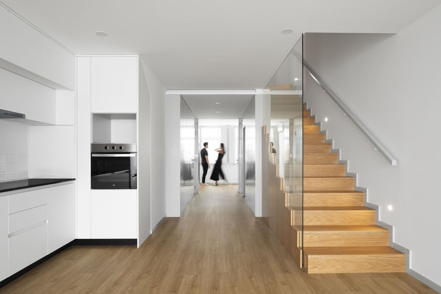 ด้วยลักษณะของตัวบ้านที่เป็นแบบหน้าแคบ การตกแต่งภายใน สถาปนิกจึงเลือกใช้สีขาวและกระจกมาเป็นองค์ประกอบหลัก จึงทำให้ภายในบ้านมีความสว่างและดูมีความกว้างขวาง