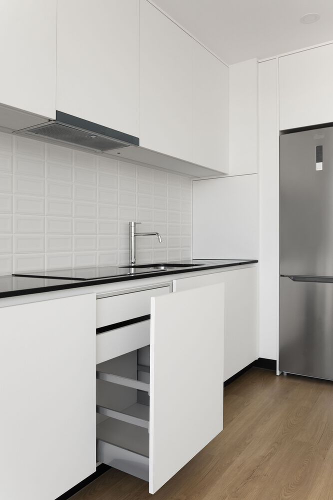 นอกจากส่วนพักอาศัยแล้ว ภายในห้องครัว ก็เป็นอีกหนึ่งจุดที่สถาปนิกได้ใส่ใจในรายละเอียดการตกแต่ง เฟอร์นิเจอร์และอุปกรณ์ต่าง ๆ ล้วนแต่มีดีไซน์ที่ทันสมัยเข้ากับธีมหลักของบ้าน