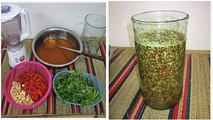 9. จากนั้นนำส่วนผสมทั้งหมดมาปั่นรวมกันโดยใส่พริก ใส่กระเทียม ใส่ผักชี ลงไปในเครื่องปั่น แล้วใส่น้ำปรุงที่เราเตรียมไว้ลงไปเผื่อให้การปั่นง่ายขึ้น ขึ้นตอนการปั่นแยกปั่นสองครั้ง