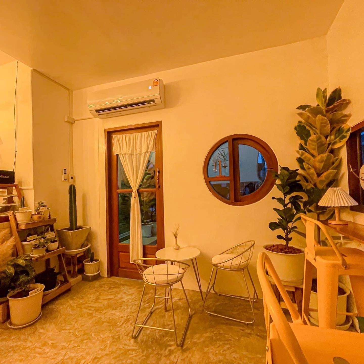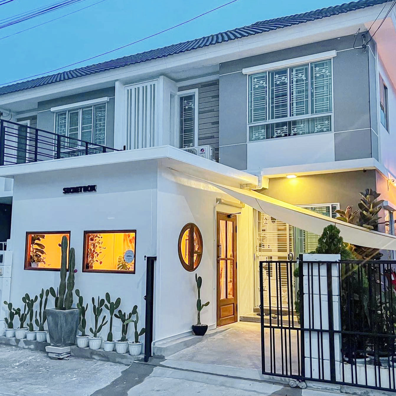 ตัวคาเฟ่ตั้งอยู่บริเวณพื้นที่หน้าบ้าน เป็นอาคารเล็ก ๆ รูปทรงสี่เหลี่ยม ตกแต่งในโทนสีขาว พร้อมกับได้บรรยากาศที่อบอุ่นจากองค์ประกอบงานไม้ จึงทำให้คาเฟ่แห่งนี้ได้ให้กลิ่นอายแบบโมเดิร์นออกมาได้เป็นอย่างดี
