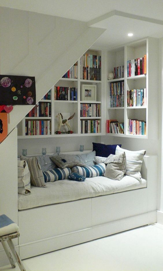 – แอบซ่อนชั้นหนังสือไว้ตามมุมต่าง ๆ ที่ไม่เคยได้ใช้ เช่น เนรมิตรช่องว่างใต้เตียงเป็นชั้นเก็บหนังสือ ฯลฯ