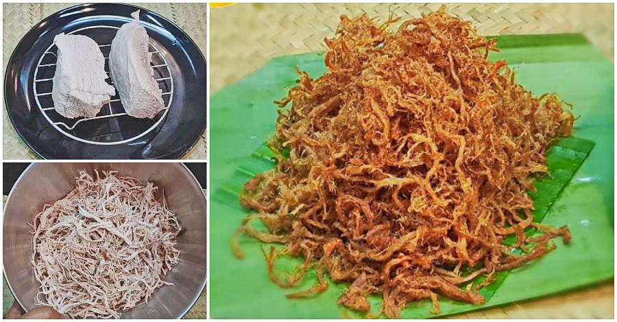 13. เมื่อรีดน้ำมันจนหมด เทใส่ถาด ค่อยๆยีหมูออกจากกันไม่ให้จับตัวเป็นก้อน