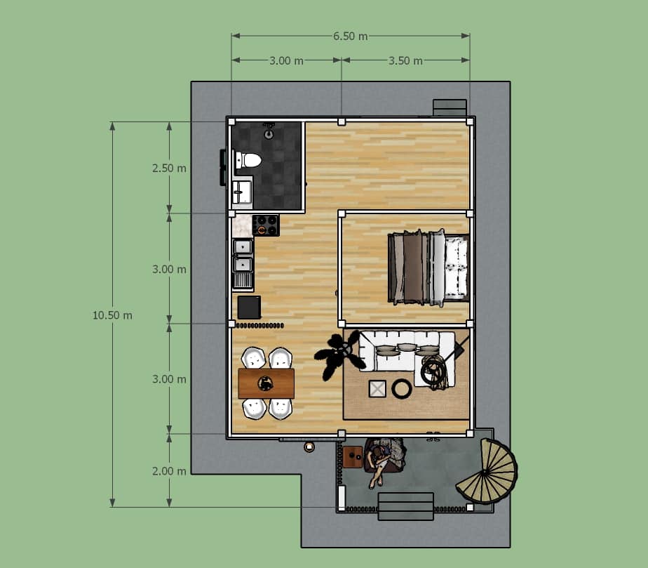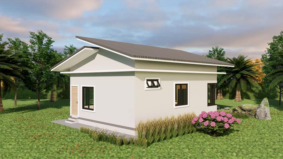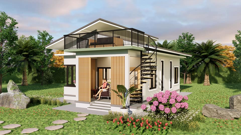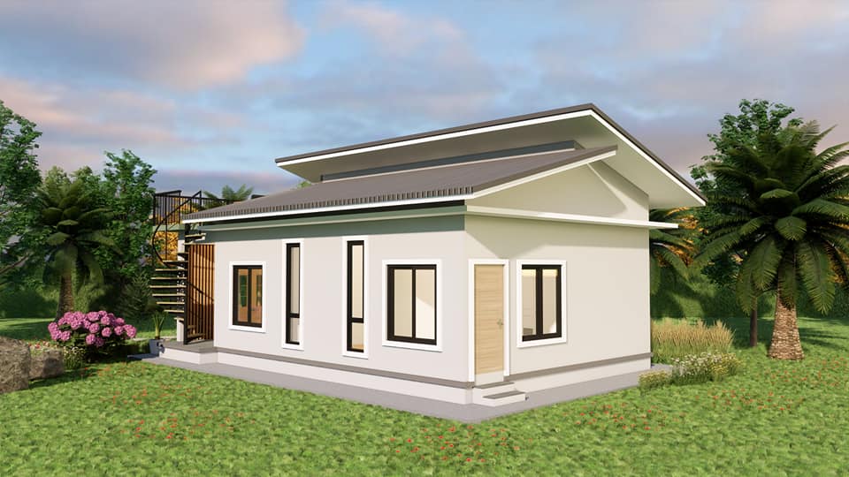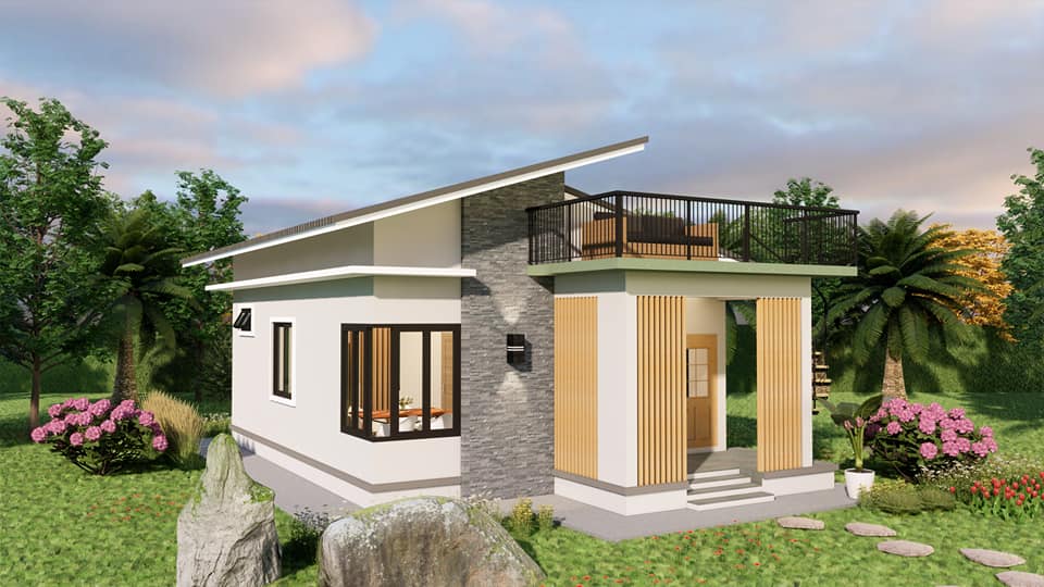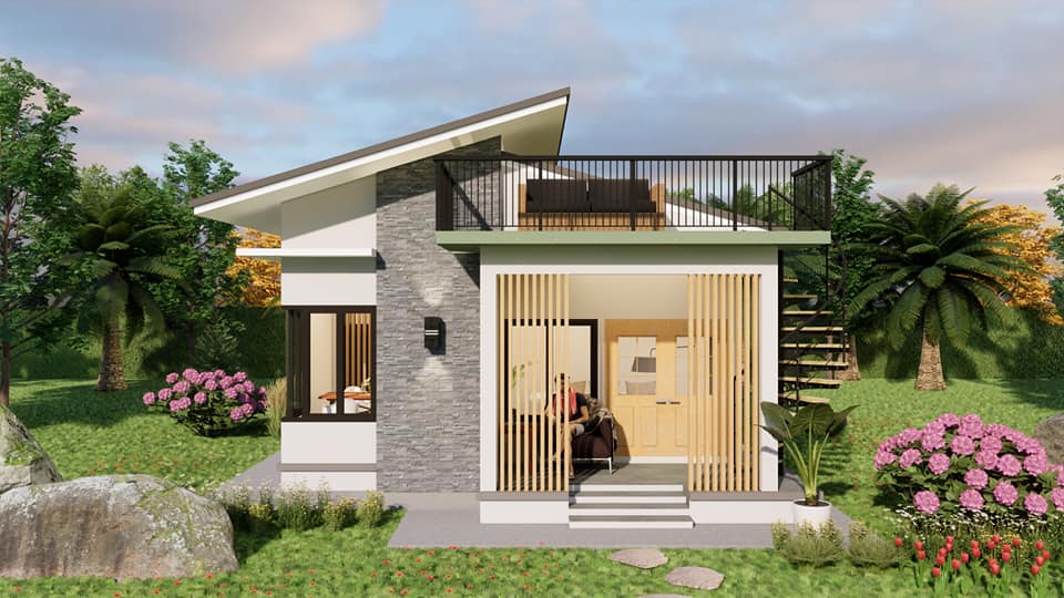 แบบบ้านสไตล์โมเดิร์นหลังนี้ประกอบไปด้วย 1 ห้องนอน 1 ห้องน้ำ 1 ห้องโถงนั่งเล่น พร้อมระเบียงหน้าบ้านและดาดฟ้าเอาไว้นั่งชิลล์ พื้นที่ใช้สอยทั้งหมดประมาณ 65 ตารางเมตร