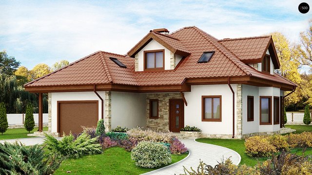 ตัวบ้านขนาดสองชั้น โครงสร้างทำจากคอนกรีต ผนังภายนอกฉาบปูนเรียบทาสีขาว ตกแต่งด้วยด้วยบล็อคหินทรายโทนสีเทา เลือกใช้หลังคาทรงปั้นหยา บริเวณทางเข้าแต่งเฉลียงหินอ่อนแบบโค้งๆ มีโรงจอดรถที่ด้านของตัวบ้าน รองรับรถยนต์จำนวน 1 คัน