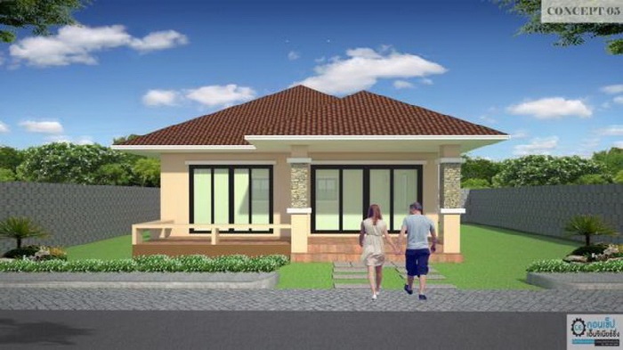 CONCEPT05 บ้านชั้นเดียว รูปทรงยอดนิยม หลังคารูปทรงปั้นหยาปูด้วยกระเบื้องสีแดงอิฐ ตัวบ้านขนาดกะทัดรัด เหมาะสำหรับครอบครับขนาดเล็กที่ต้องการบ้านสำหรับครอบครัวในงบประมาณที่ไม่แพงจนเกินไป บ้านหลังนี้มาพร้อมกับระเบียงหน้าบ้านสำหรับจัดเป็นมุมพักผ่อน
