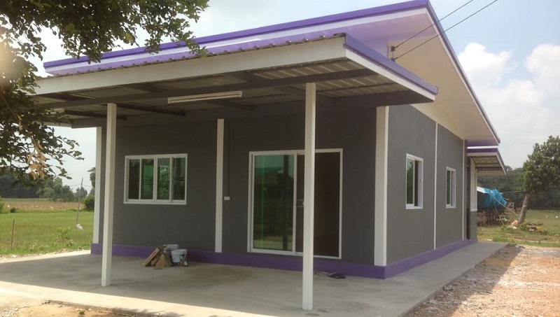 ลักษณะบ้านชั้นเดียว ปูฐานคอนกรีตสำหรับตัวโครงสร้าง หลังคาเพิงหมาแหงน ผนังภายนอกตกแต่งด้วยโทนสีเทา ตัดกับขอบมุมสีขาวและสีม่วงพอให้ดูมีสีสัน