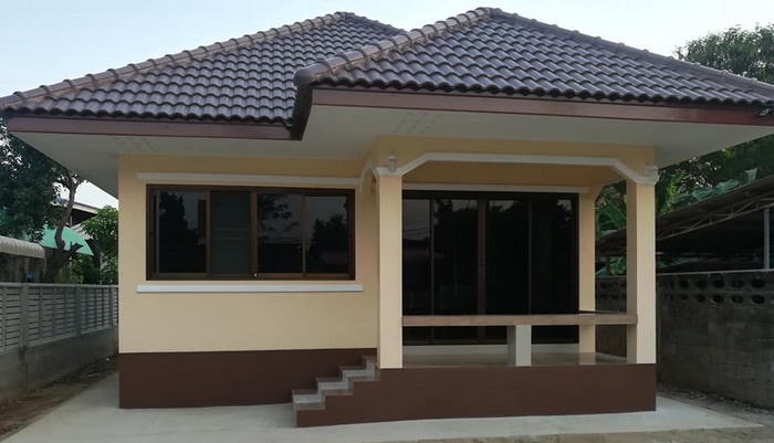 บ้านชั้นเดียวยกพื้นสูง โครงสร้างคอนกรีตเสริมเหล็ก ผนังก่ออิฐฉาบปูนแต่งแต้มด้วยโทนสีครีม รับกับตัวฐานสีน้ำตาลเข้ม หลังคาทรงปั้นหยามุงกระเบื้องลอนโทนสีทึบ มาพร้อมเฉลียงขนาดพอเหมาะจัดเป็นพื้นที่สำหรับพักผ่อนรับบรรยากาศธรรมชาตินอกบ้าน