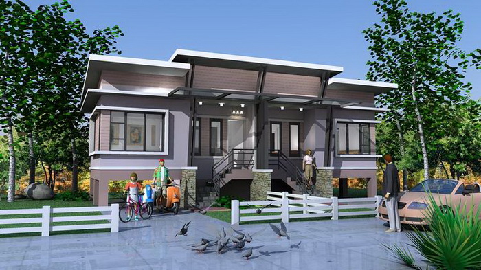ลักษณะเป็นแบบบ้านแฝดชั้นเดียว ยกพื้นต่ำ ออกแบบเหมือนกันทั้งสองด้าน ผนังใช้โทนสีเทา และกรุด้วยไม้ฝาสีชมพูดุอ่อนหวาน แถมตกแต่งเสาด้วยอิฐสีเทา หลังคาเพิงหมาแหงน แผงกันสาดบันไดทางขึ้น ให้บ้านมีมิติสุดๆ