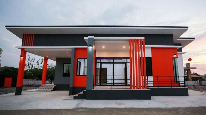 ลักษณะบ้านชั้นเดียว ออกแบบด้วยสไตล์โมเดิร์น หลังคารูปทรงเพิงหมาแหงนมุงด้วยกระเบื้อง ตกแต่งภายนอกด้วยโทนสีเทา แซมด้วยสีแดงที่ให้ความรู้สึกร้อนแรง มีพื้นที่ระเบียงหน้าบ้านที่โปร่งโล่งเหมาะสำหรับเป็นมุมพักผ่อน พร้อมกับพื้นที่สำหรับจอดรถหนึ่งคัน