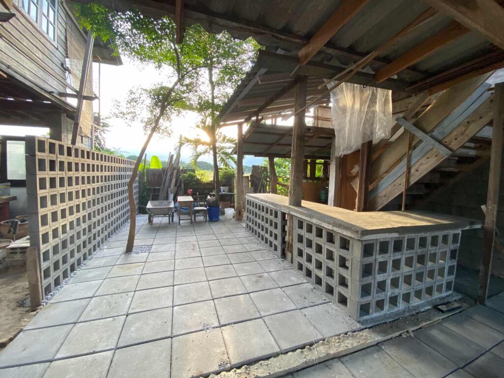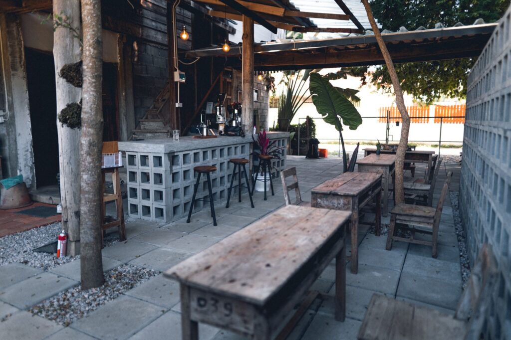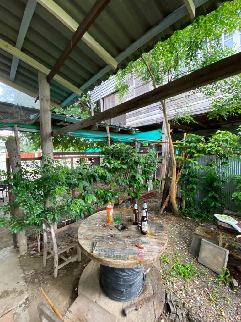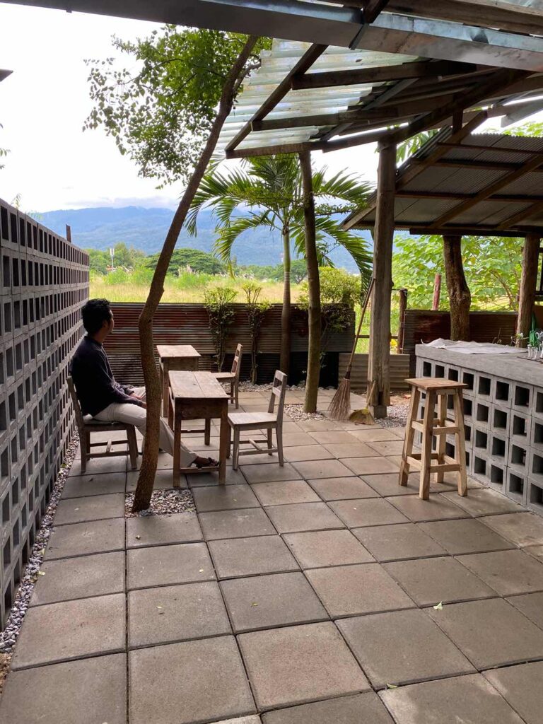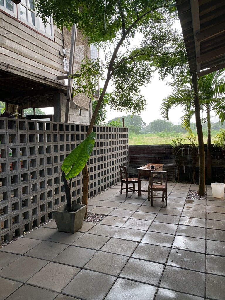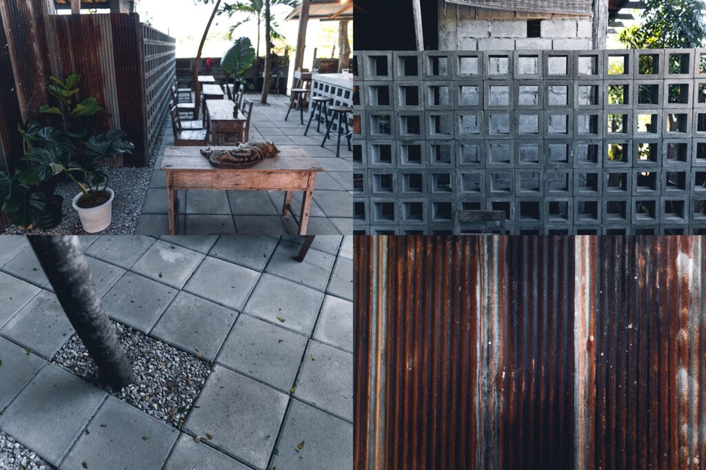 วัสดุที่เลือกใช้ครับ สังกะสีเก่า บล็อกช่องลม แผ่นบล็อกปูพื้น 40×40 โต๊ะเก้าอี้นักเรียนเก่าจากร้านไม้เก่ามือสอง