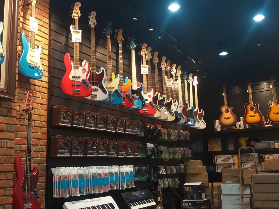 รูปร้านค้าเครื่องดนตรี แต่อาจจะสามารถนำมาประยุกต์ใช้ในบ้านได้ ซึ่งสามารถจัดทำเป็นห้องสตูดิโอดนตรีในบ้าน หรือ ห้องเก็บของได้ โดยไม่ต้องซื้อชั้นวางของที่อาจจะกินพื้นที่ในบ้านมากจนเกินไป frameindex.com