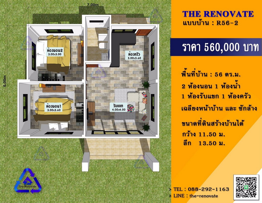 แบบบ้านสไตล์คอนเทมโพรารีหลังนี้ประกอบไปด้วย 2 ห้องนอน 1 ห้องน้ำ 1 โถงรับเเขก 1 ห้องครัว มีลานซักล้างและเฉลียงหน้าบ้าน พื้นที่ใช้สอยทั้งหมดประมาณ 56 ตารางเมตร งบก่อสร้างอยู่ที่ประมาณ 560,000 บาท