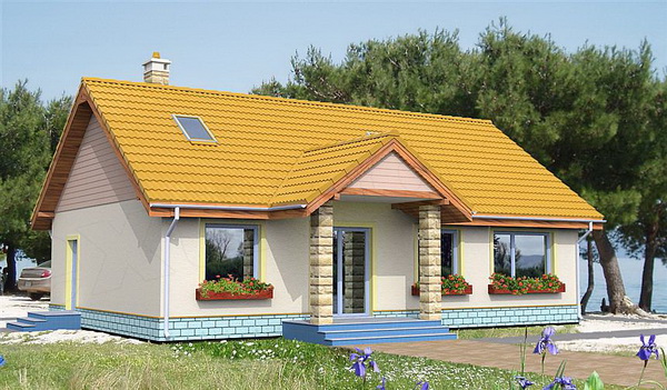 บ้านหลังนี้ออกแบบเป็นบ้านหน้ากว้าง โครงสร้างทำจากคอนกรีต เลือกใช้หลังคาทรงจั่วมุงด้วยกระเบื้องโทนสีเหลือง ผนังภายนอกฉาบด้วยปูนสีขาวเรียบ เสริมดีเทลการตกแต่งด้วยเสาหินที่ทางเข้า พร้อมอิฐโชว์แนวสีฟ้าเก๋ๆ