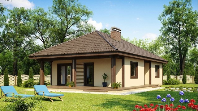 ตัวบ้านเหลือใช้โครงสร้างคอนกรีต เพื่อความแข็งแรง และภูมิฐานไปในตัว เป็นค่านิยมของบ้านที่คนไทยชื่นชอบ ใช้หลังคาปั้นหยาสีน้ำตาล ดูเรียบง่าย สบายตา และมีเฉลียงรองรับกิจกรรมได้อย่างกว้างขวาง