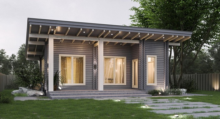 นี่คือบ้านชั้นเดียวขนาดกะทัดรัด ออกแบบโดย Ivan Amosov มีพื้นที่ใช้สอย 42 ตารางเมตร ตัวบ้านมีโครงสร้างไม้ ผนังประกอบขึ้นจากแผ่นไม้เทียมทั้งหลัง ตกแต่งในโทนสีเทาอ่อนแซมด้วยสีขาว ดูสวยงามเป็นธรรมชาติ แฝงด้วยรูปลักษณ์ที่ทันสมัย