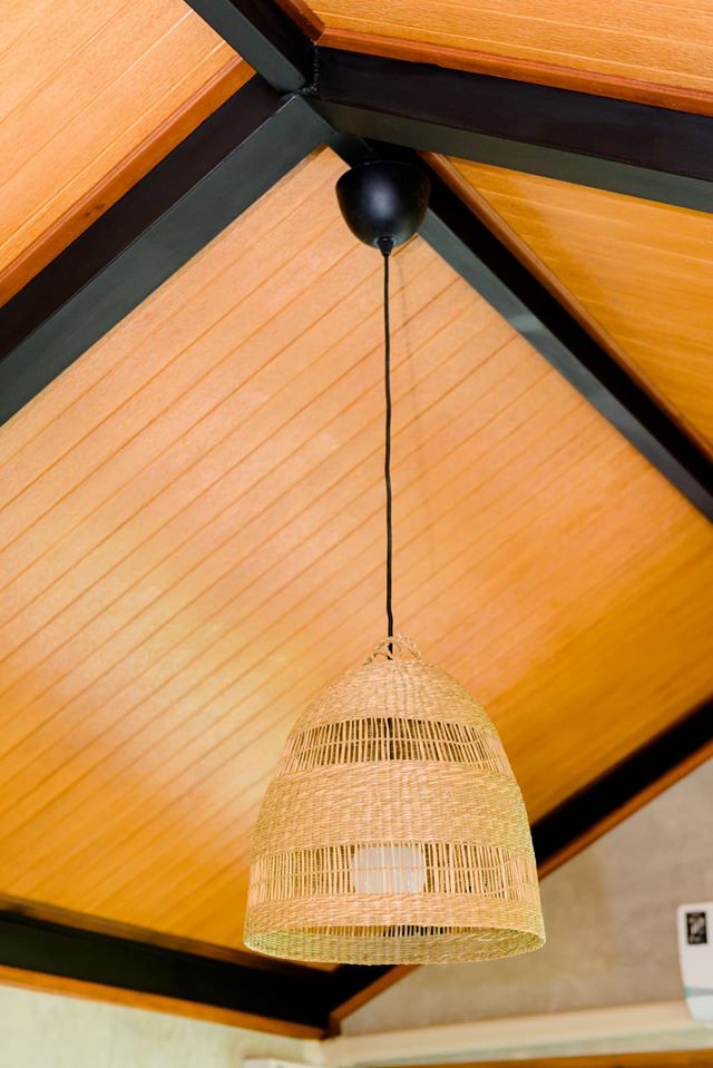 ผนังภายในเลือกใช้ปูนเปลือยโทนสีอ่อน ปูพื้นไม้มะค่า ผสมผสานไปกับงานไม้ของประตูและวงกบหน้าต่าง โดยหน้าต่างบางส่วนนั้นยังเลือกใช้กระจกสี ให้กลิ่นอายเหมือนกับบ้านแนวไทยโบราณ นอกจากนี้ ฝ้าหลังคายังเป็นแบบโปร่ง ตกแต่งด้วยโคมไฟระย้าทรงสุ่มไก่สวยงาม