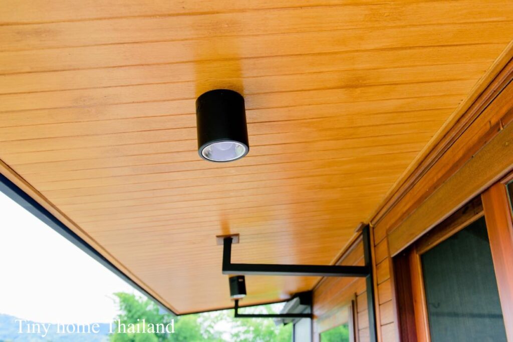 ตัวบ้านชั้นเดียว ยกพื้นสูง ก่อสร้างจากโครงเหล็ก หลังคาทรงจั่วเรียบง่าย มีระเบียงและชายคายื่นออกไปด้านข้าง ผนังภายนอกตกแต่งด้วยไม้จริง ให้ภาพลักษณ์บ้านแบบไทยสมัยก่อน ส่วนหน้าของอาคารติดตั้งประตูกระจกแบบเลื่อนได้ สะท้อนให้เห็นวิวสวยงามของท้องฟ้าและต้นไม้สีเขียว