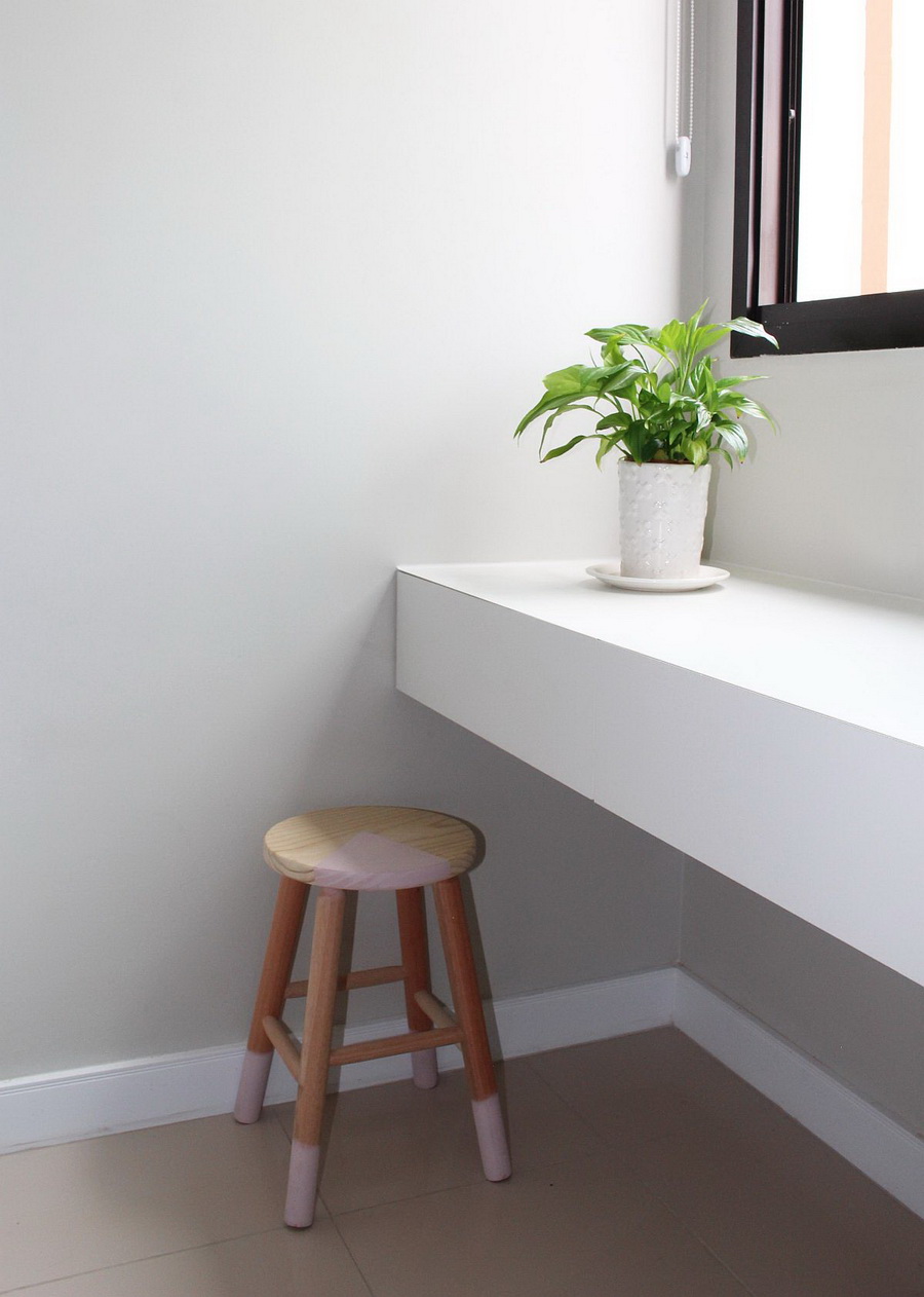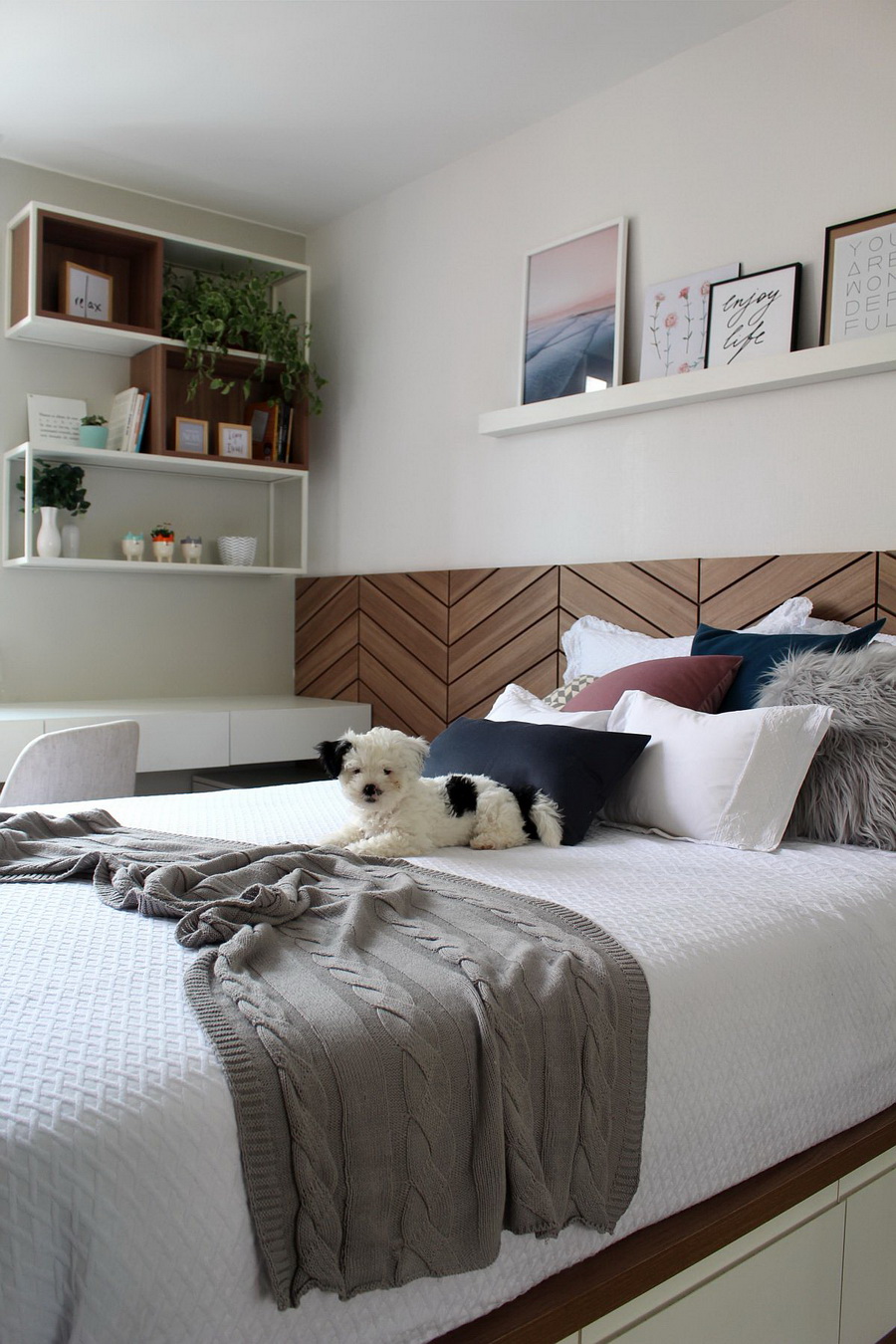 สถาปนิกออกแบบภายในเลือกใช้โทนสีขาวเพื่อให้ภายในห้องนอนมีความสว่าง พร้อมปรับเปลี่ยนองค์ประกอบภายในห้องเล็ก ๆ ห้องนี้ใหม่ โดยตู้เสื้อผ้าเก่าถูกนำออกไป เปลี่ยนเป็นพื้นที่ใช้สอยให้หลากหลายมากขึ้น ห้องจึงมีความโปร่งโล่งและสว่างมากยิ่งขึ้น