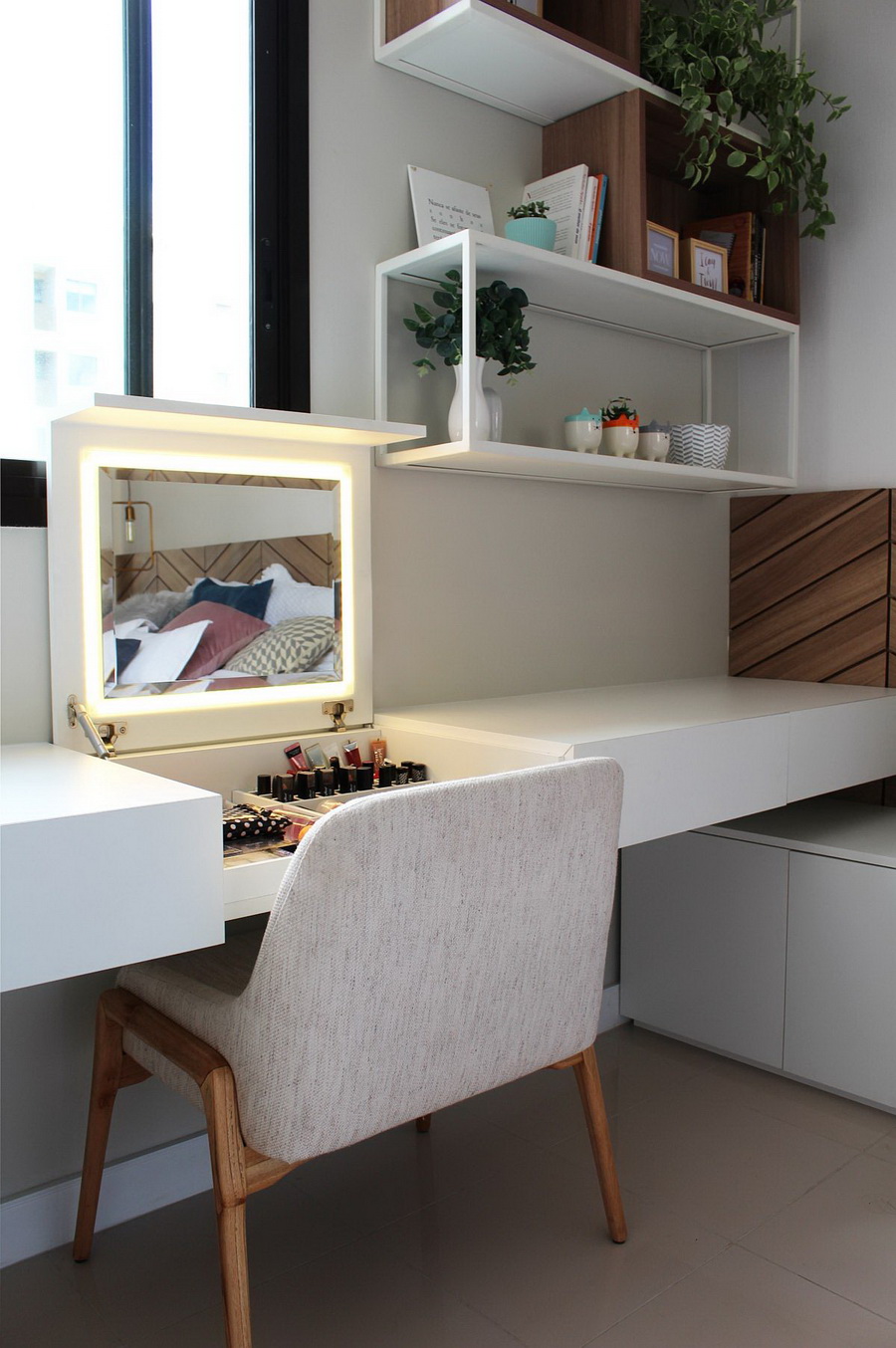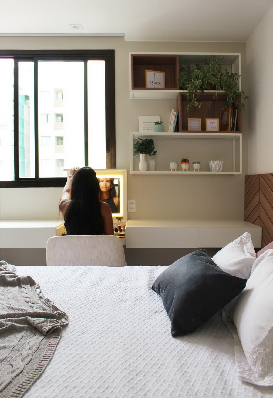 อีกด้านหนึ่งของเตยงเป็นโต๊ะเรียนแบบปรับได้ในโทนสีขาวบางเฉียบ ซึ่งมีช่องว่างสำหรับกระจกที่เปิดออกและช่องสำหรับใส่อุปกรณ์เสริมที่สะดวกสุด ๆ